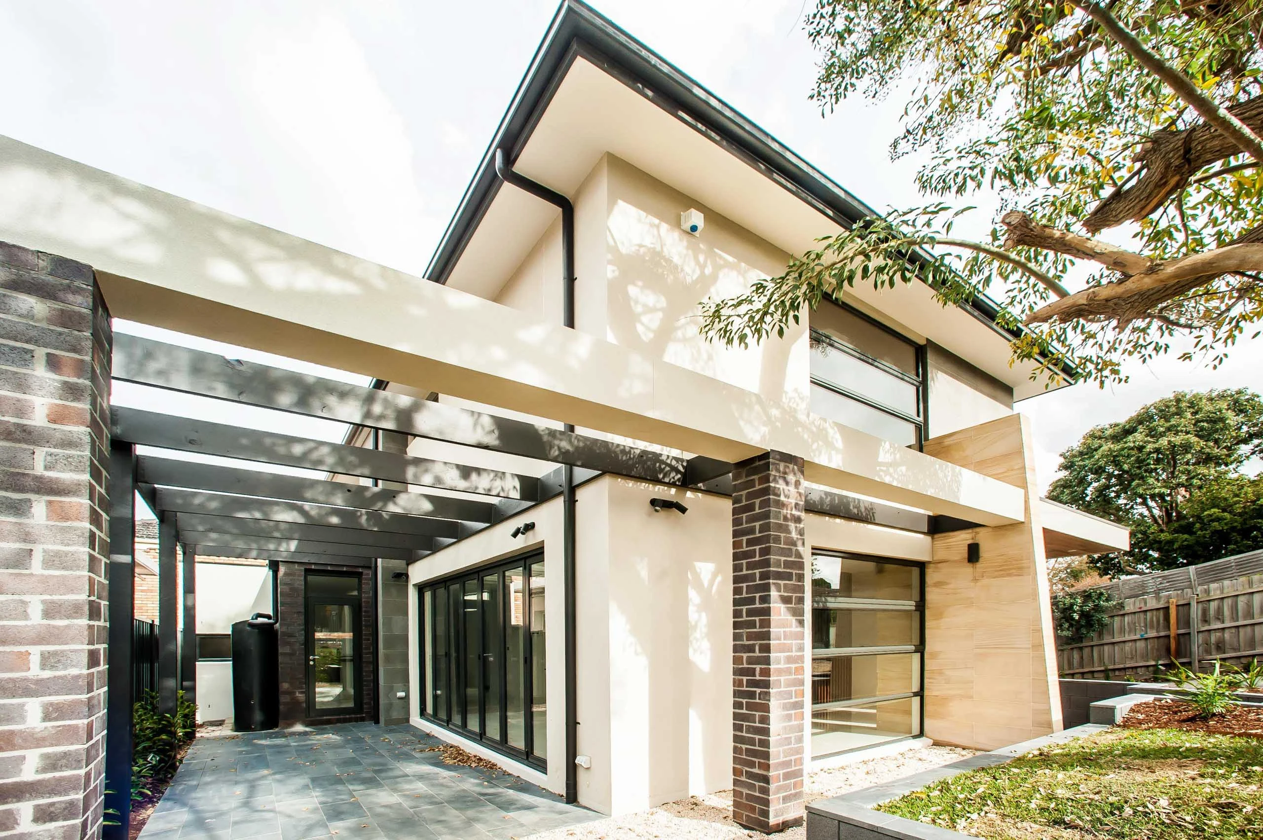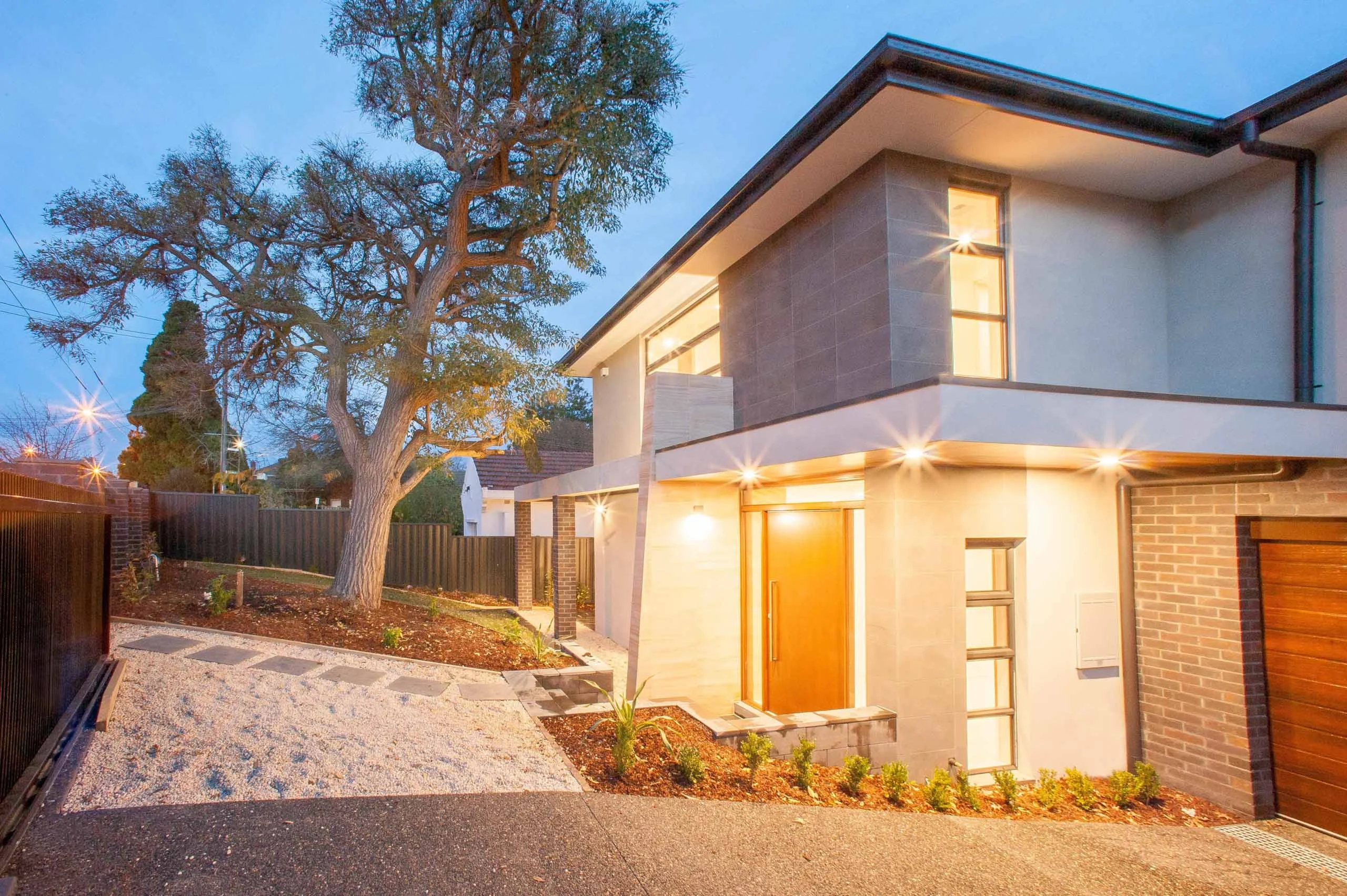 The external landscaping area has blue stone paving, composite timber decking, timber pergola, exposed aggregate driveway, automatic vehicle sliding gate and metal fencing.
