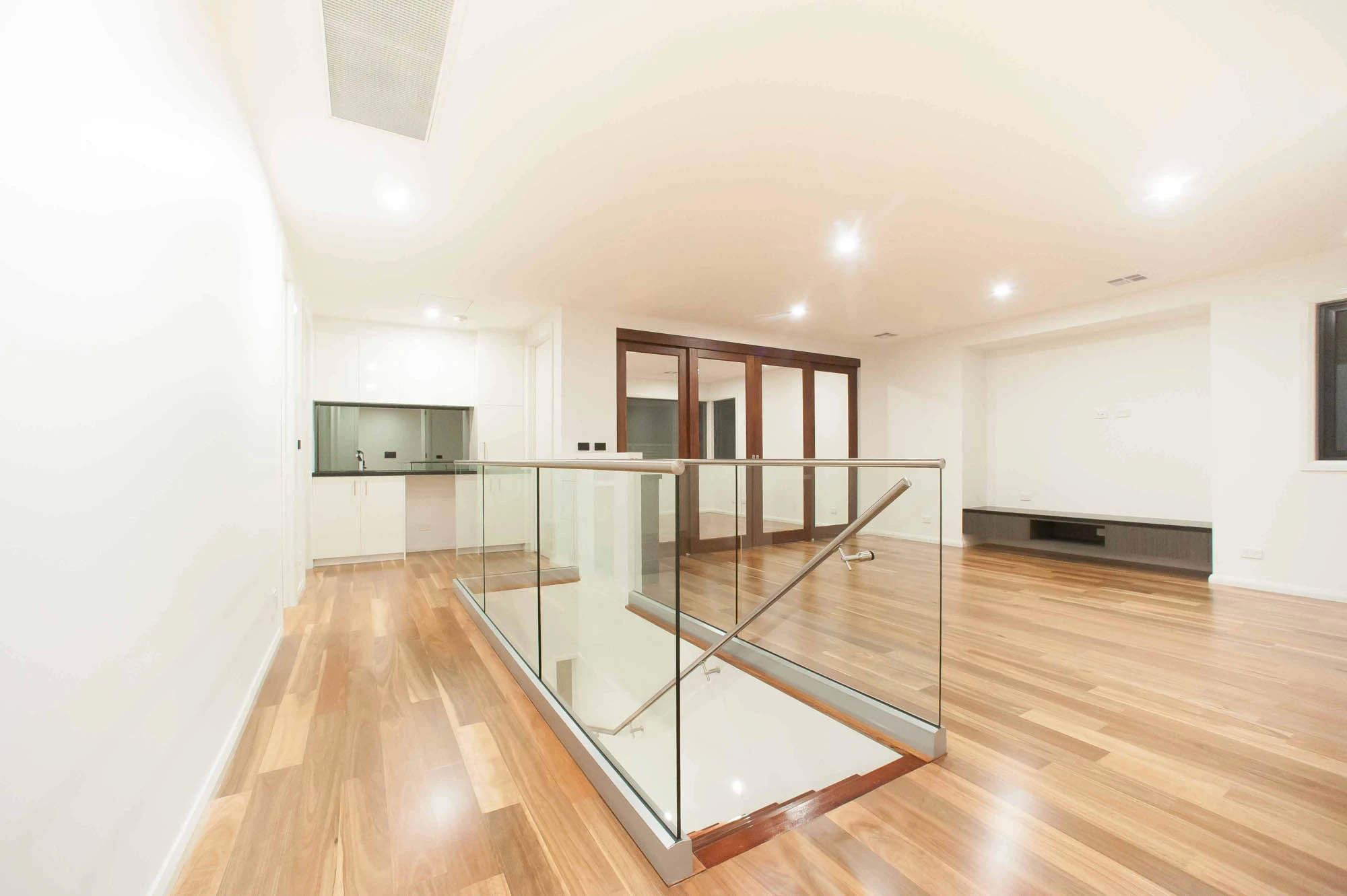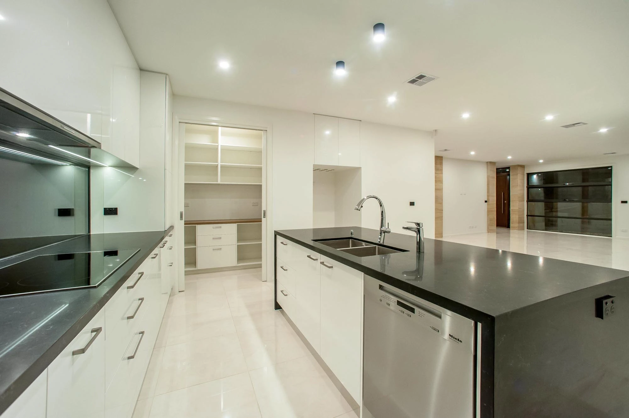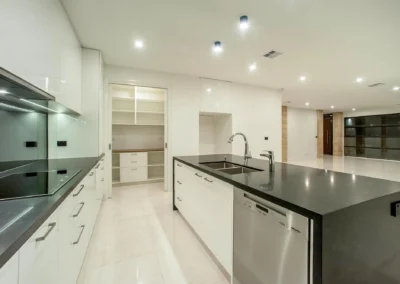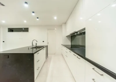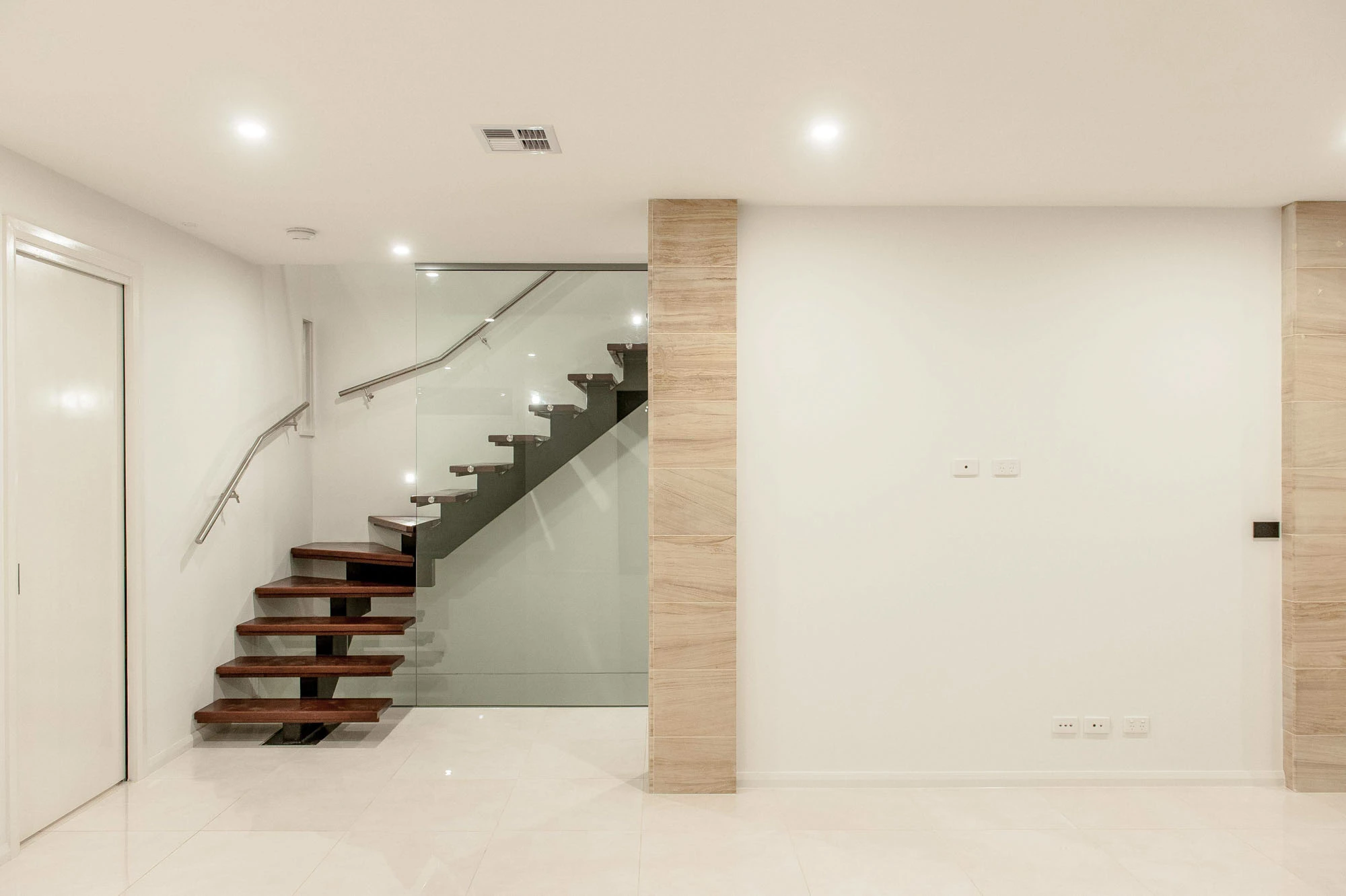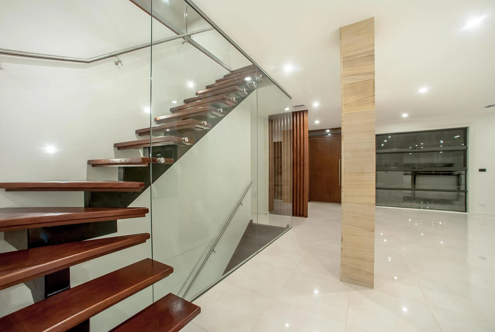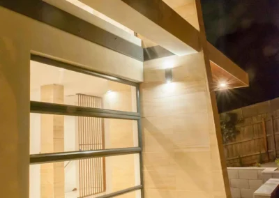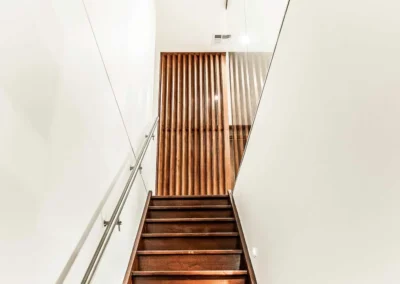 The interior design concept is to connect the exterior to interior with feature sandstone internal columns, open tread central steel stringer staircase with glass balustrade to maximise the lighting in stairwell, timber batten screen at entrance, timber veneer vanity unit with light stone bench top and wall tiles, feature mosaic tile in shower niche, timber veneer wardrobe, Miele appliances, high quality tapware and spotted gum timber flooring.