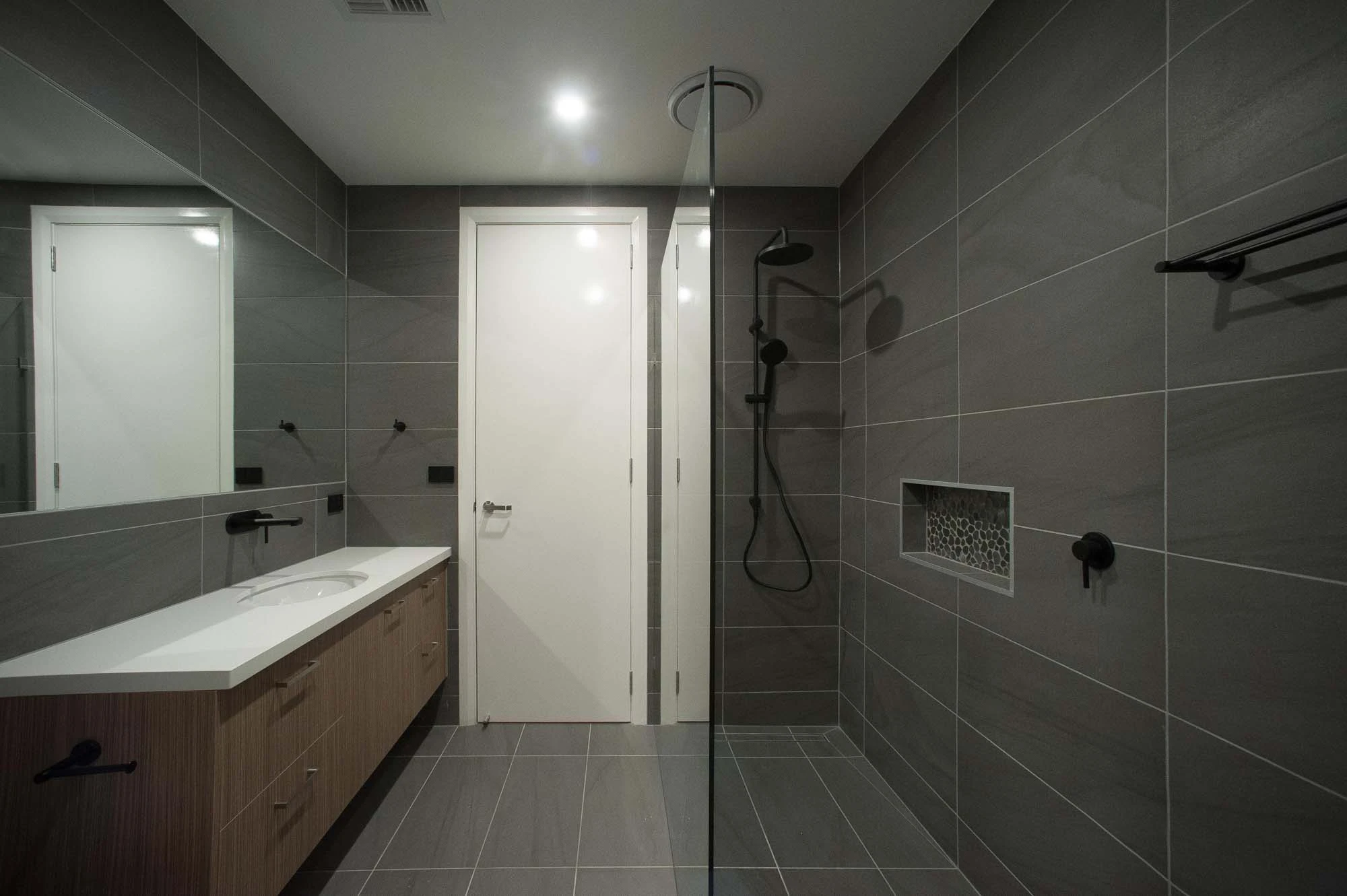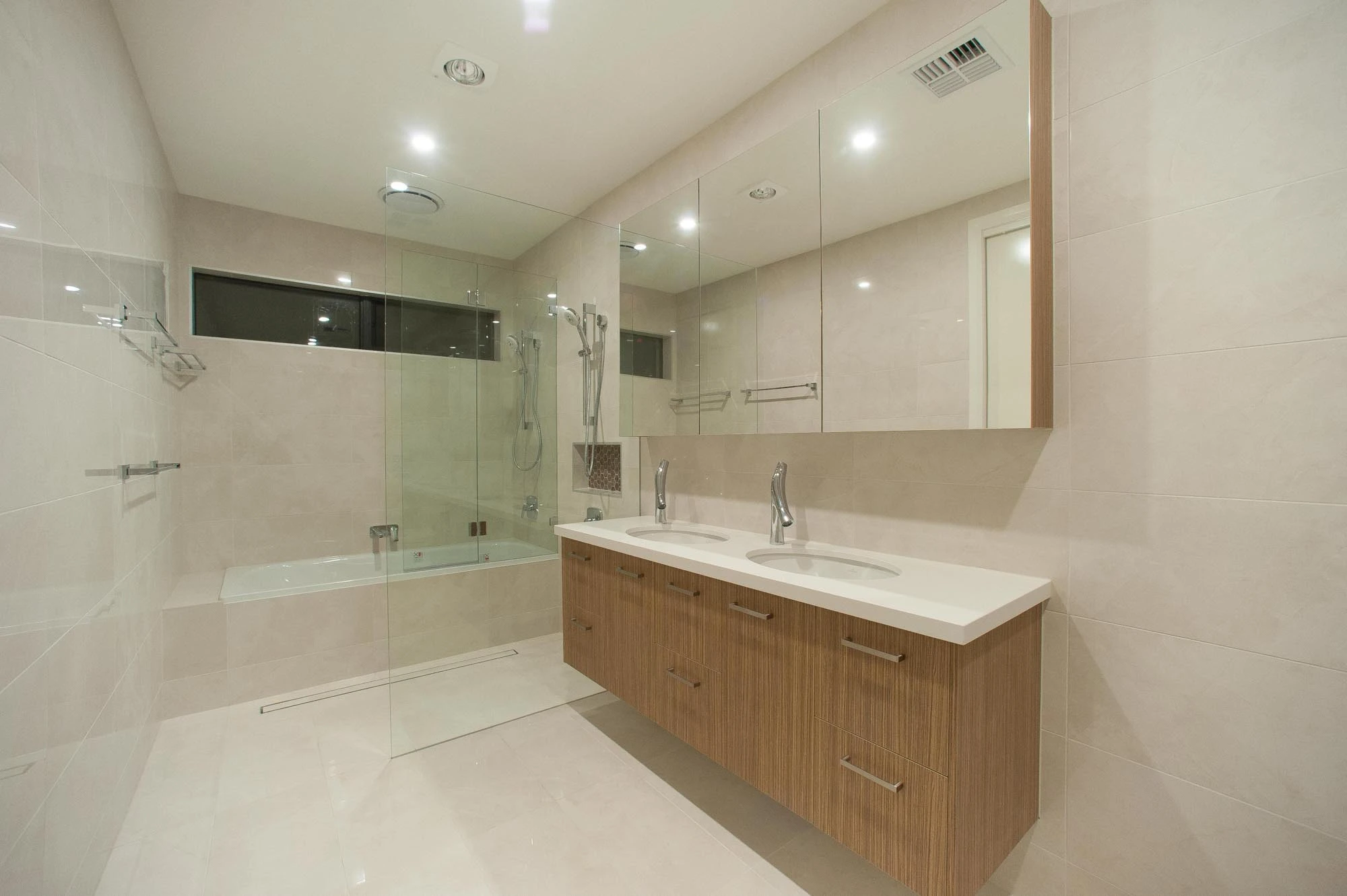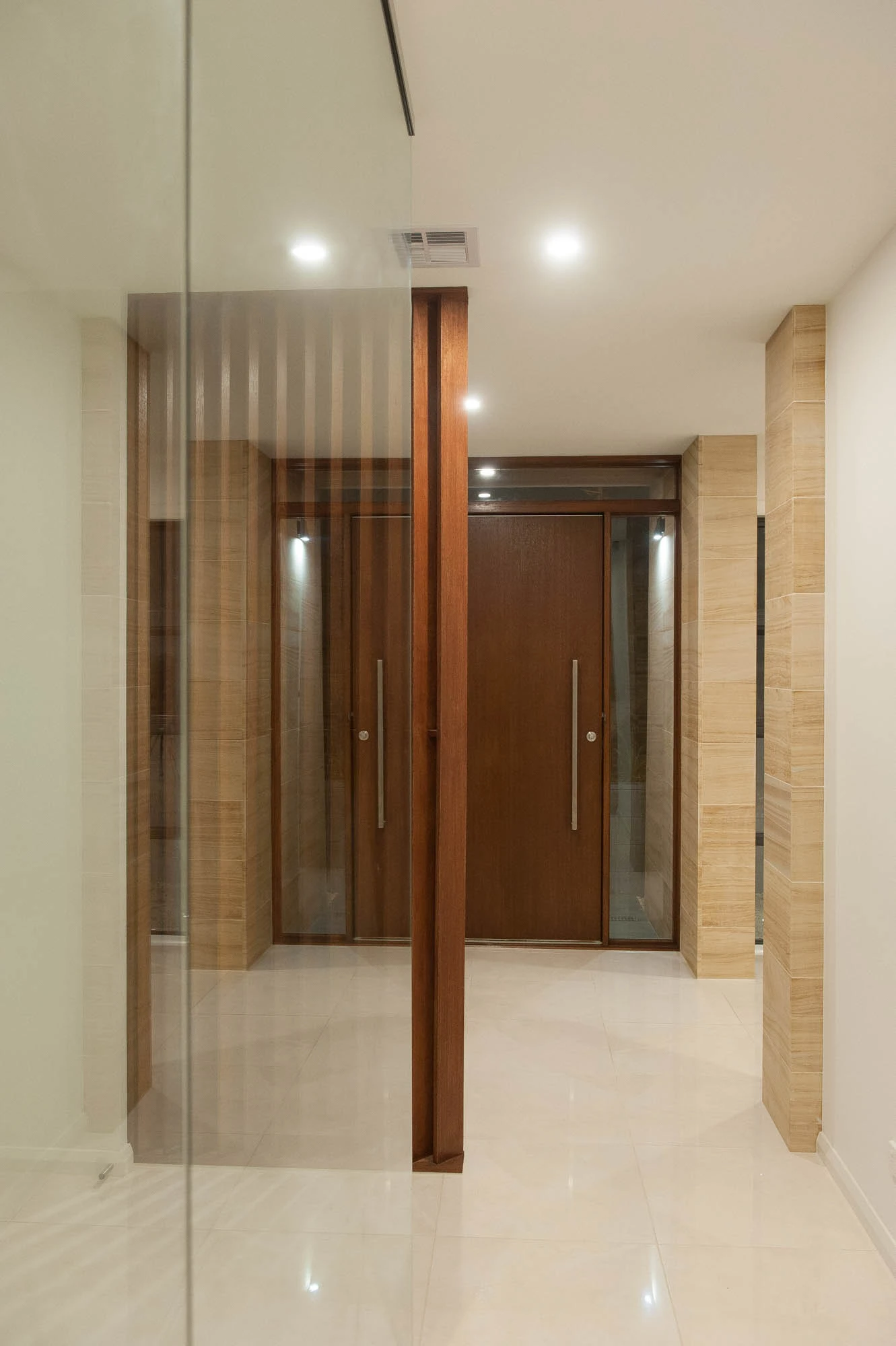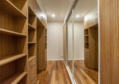 The interior design concept is to connect the exterior to interior with feature sandstone internal columns, open tread central steel stringer staircase with glass balustrade to maximise the lighting in stairwell, timber batten screen at entrance, timber veneer vanity unit with light stone bench top and wall tiles, feature mosaic tile in shower niche, timber veneer wardrobe, Miele appliances, high quality tapware and spotted gum timber flooring.