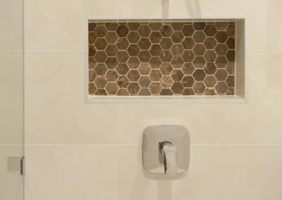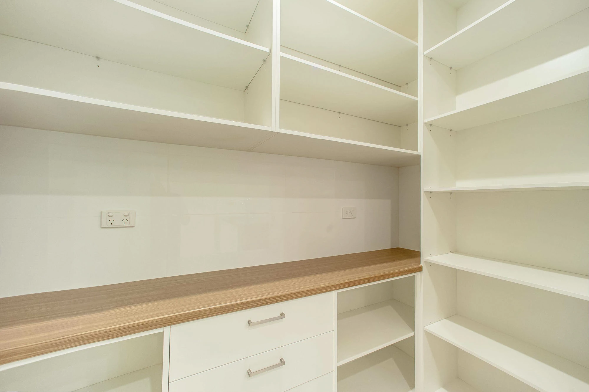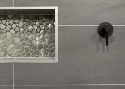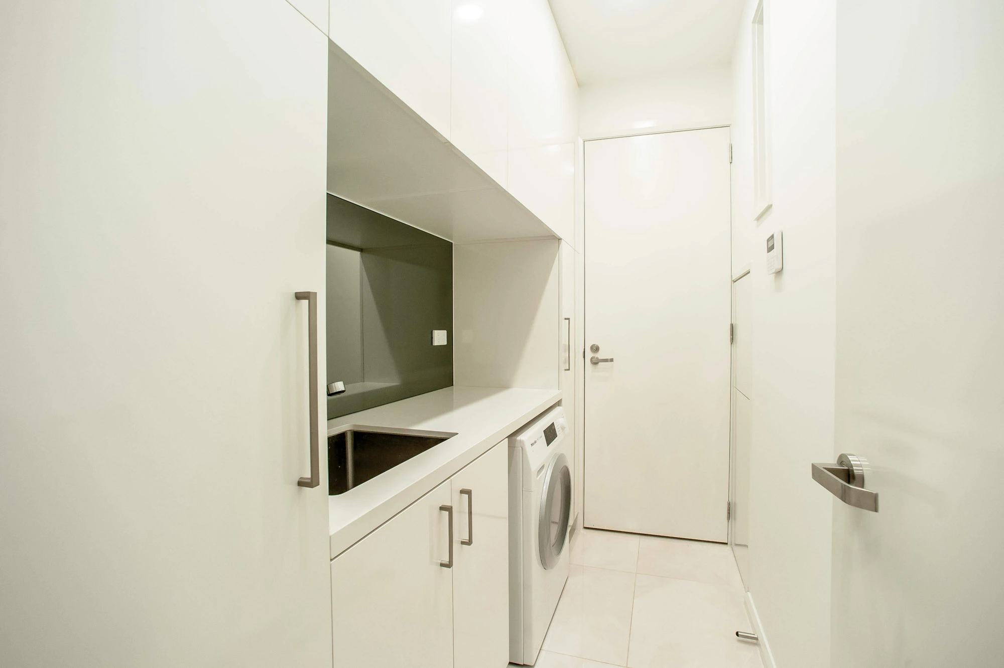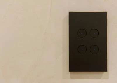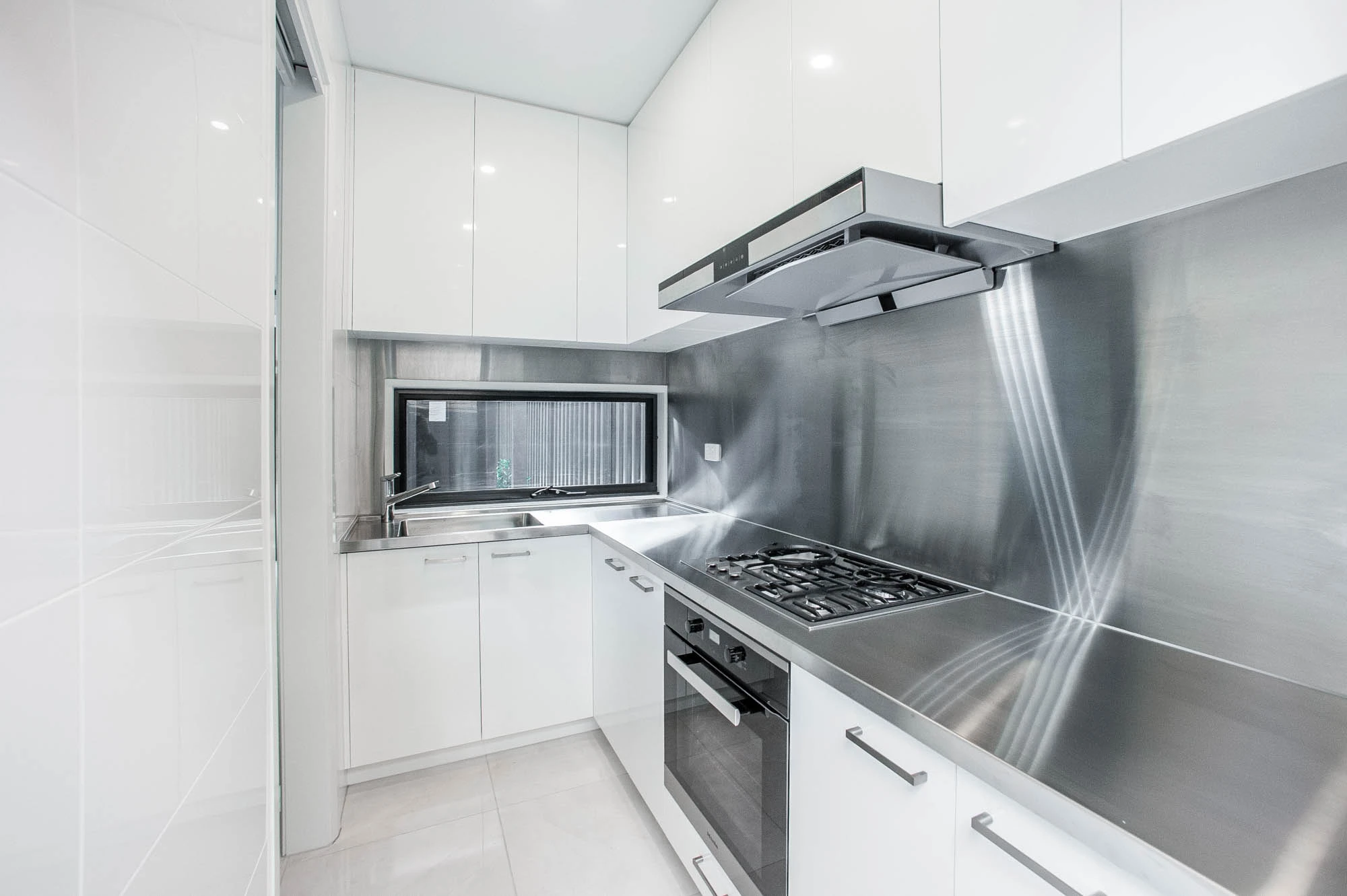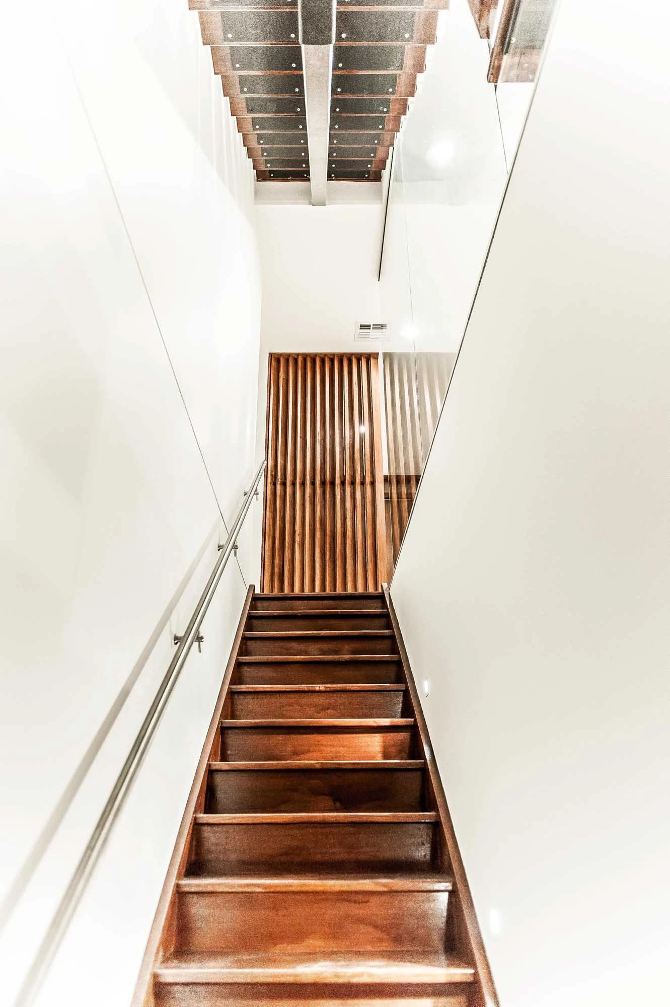 The interior design concept is to connect the exterior to interior with feature sandstone internal columns, open tread central steel stringer staircase with glass balustrade to maximise the lighting in stairwell, timber batten screen at entrance, timber veneer vanity unit with light stone bench top and wall tiles, feature mosaic tile in shower niche, timber veneer wardrobe, Miele appliances, high quality tapware and spotted gum timber flooring.